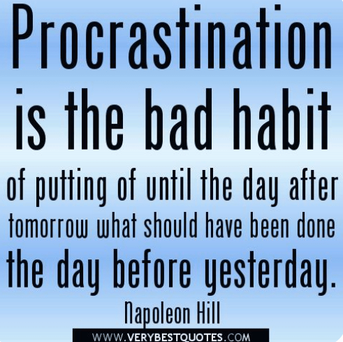 Procrastination has prevented me from doing so many great things. I would have earned better grades, saved more money, be in better shape and the list goes on. It is so easy to say that something can be done later, but later may not be the best time. I’ve decided to stop ( or at least slow down) how much I procrastinate. I don’t want to stress myself out by trying to do everything at once but I want to make realistic time lines and schedules so that I can be more productive. I have to stop thinking that I can do things later because later may not be an option.